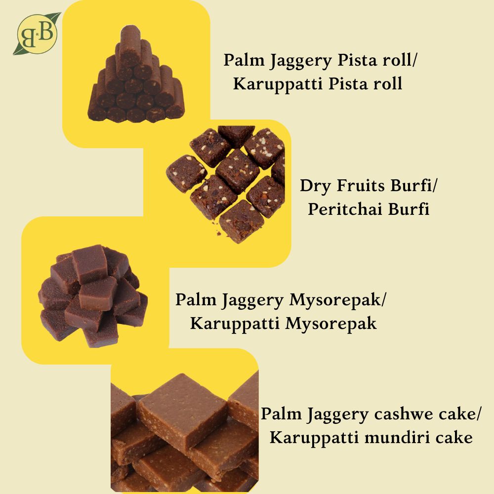 Light up your festival with our B&B Organics Diwali delight. Indulge in the rich flavors of Palm Jaggery Pista Roll (Karuppatti Pista Roll), Dry Fruits Burfi (Peritchai Burfi) Palm Jaggery Mysorepak (Karuppatti Mysorepak) Palm Jaggery Cashew Cake (Karuppatti Mundiri Cake).