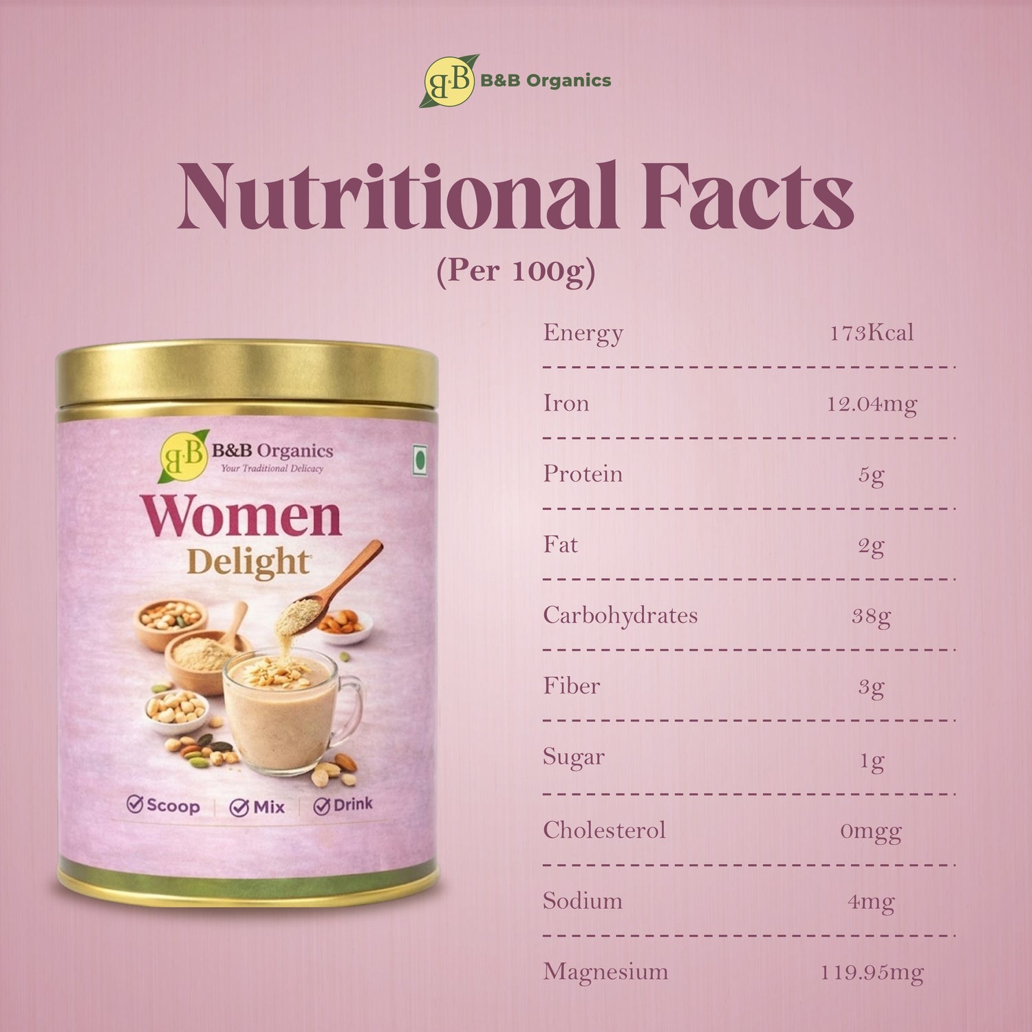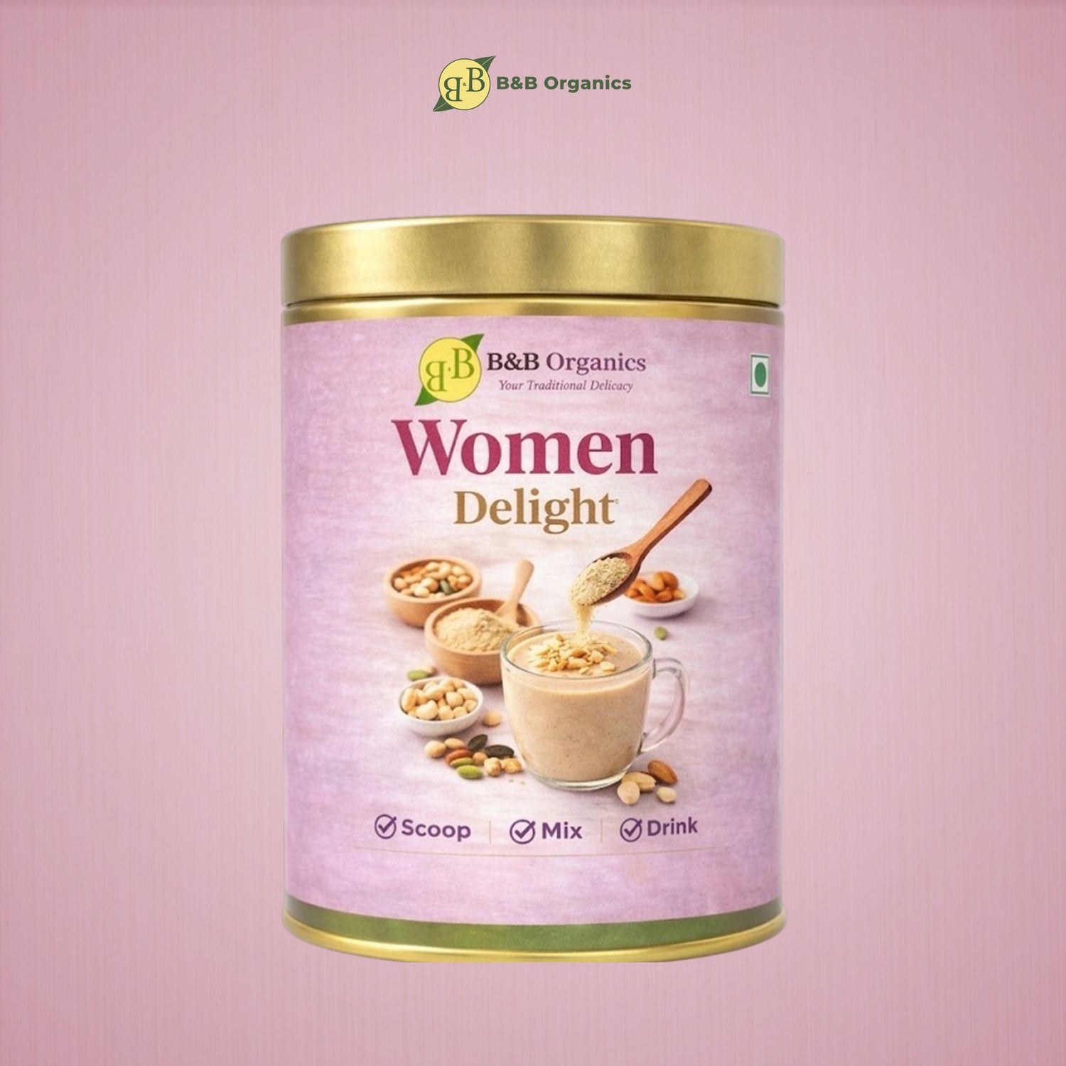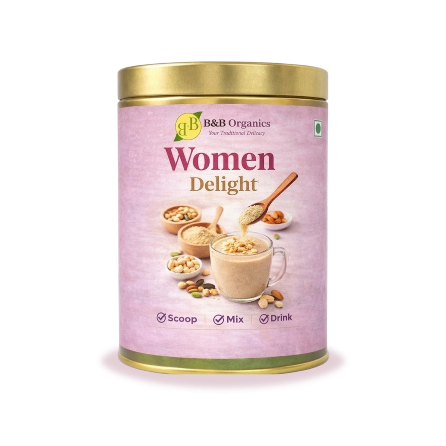 B&B Organics Women Delight Health Mix is a traditional nutrition blend made with ancient grains, pulses, nuts, and seeds to support women’s strength, energy, and overall wellness. Rich in iron, protein, and fiber, this wholesome drink helps improve stamina, digestion, and daily nourishment naturally.